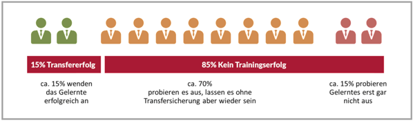 Fehlt eine strukturierte Transfersicherung aus den Trainings werden nur ca. 15% teile daraus Umsetzen und anwenden. (Quelle: Prof. Robert O. Brinkerhoff. Studie: What if Training Really Had To Work 2006)
